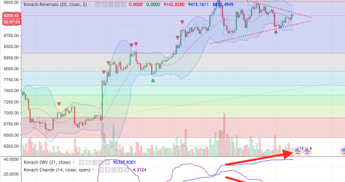 - Divergence between the Kovach OBV (blue line) which measures long term momentum, and the Kovach Chande (purple line) which measures short term momentum