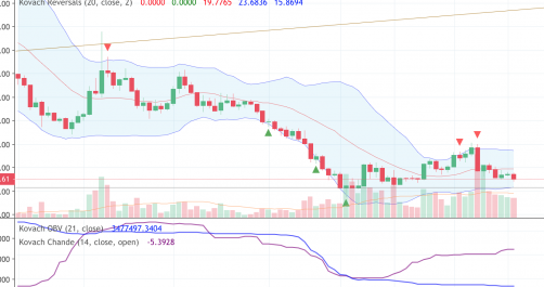 Currently, neo is near the central moving average of the Kovach Reversals Indicator, which sits at about 19.58.  It still has some room between current prices and the lower bound of this indicator at 15.61, which will provide support.